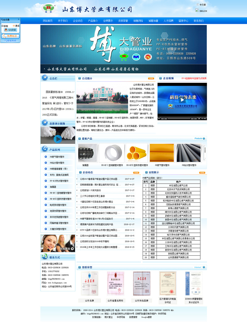 公司是中國城市燃?xì)鈪f(xié)會、中國塑料加工工業(yè)協(xié)會塑料管道專業(yè)委員會會員單位。公司被評為全國誠信守法民營企業(yè)、全國重質(zhì)量守信譽先進(jìn)單位、山東省高新技術(shù)企業(yè)、山東省重合同守信用企業(yè)、山東省消費者信得過單位、日照市優(yōu)秀民營科技企業(yè)、日照市AAA信用企業(yè)、日照市行業(yè)領(lǐng)軍品牌、日照市質(zhì)量管理先進(jìn)企業(yè)。公司生產(chǎn)的“博源”牌系列產(chǎn)品榮獲“山東名牌”、“山東著名商標(biāo)”“知名品牌”稱號。