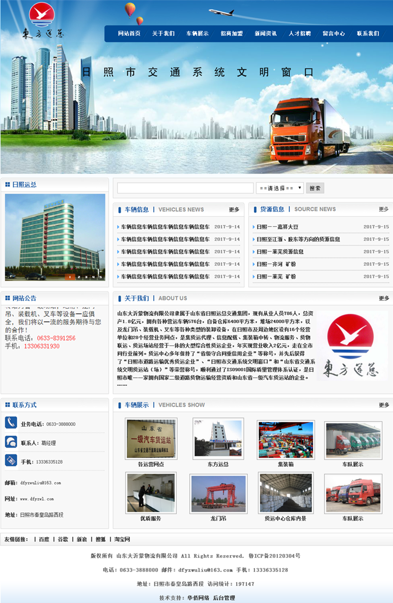 山東大沂蒙物流有限公司隸屬于山東省日照運總交通集團,現(xiàn)有從業(yè)人員786人,總資產(chǎn)1.8億元,擁有各種營運車輛576臺,自備倉庫6400平方米,堆場24000平方米,以及龍門吊、裝載機、叉車等各種類型的裝卸設備,在日照市及周邊地區(qū)設有16個經(jīng)營單位和28個經(jīng)營業(yè)務網(wǎng)點,是集貨運代理、信息配載、集裝箱中轉(zhuǎn)、物流服務、貨物聯(lián)運、貨運場站經(jīng)營于一體的大型綜合性貨運企業(yè),年實現(xiàn)營業(yè)收入2億元,走在全市同行業(yè)前列。貨運中心多年保持了“省級守合同重信用企業(yè)”等稱號,并先后獲得了“日照市道路運輸優(yōu)秀貨運企業(yè)”、“日照市交通系統(tǒng)文明窗口”和“山東省交通系統(tǒng)文明貨運站(場)”等榮譽稱號,順利通過了ISO9001國際質(zhì)量管理體系認證,是日照市唯一一家擁有國家二級道路貨物運輸經(jīng)營資質(zhì)和山東省一級汽車貨運站的企業(yè)。